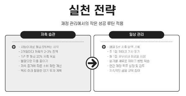 - 동전 모으기 → 커피값 줄이기 → 불필요한 정기 구독 서비스 정리 → 월 고정 지출 20% 감소