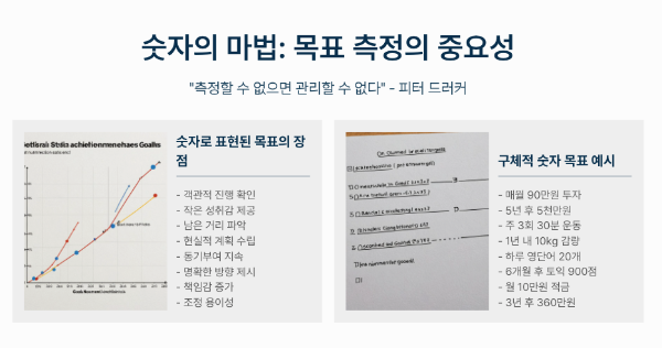 "측정할 수 없으면 관리할 수 없다"는 피터 드러커의 말처럼, 목표를 숫자로 표현하면 진전 상황을 명확하게 파악할 수 있습니다. 제가 주식 투자를 시작했을 때, 막연히 '돈을 모으자'라는 생각으로 시작했다가 실패한 경험이 있습니다. 그러다 '매월 급여의 30%인 90만원을 주식에 투자하여 5년 후 5,000만원 달성'이라는 구체적인 숫자 목표를 세우고 나서야 진정한 변화가 시작되었습니다.