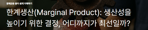 - 한계생산: 노동자 1명을 추가했을 때 얼마나 생산량이 증가하는지를 의미합니다.
