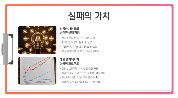 실패는 성공을 위한 필수 과정입니다. 실패를 통해 우리는 무엇이 작동하지 않는지 배우고, 더 나은 방향으로 나아갈 수 있는 통찰력을 얻게 됩니다. 진정한 성장은 편안함의 영역을 벗어나 실패의 가능성을 안고도 도전하는 순간에 이루어집니다.