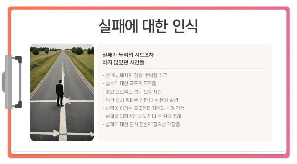 그때 깨달았습니다. 실패를 두려워하는 마음이 오히려 더 큰 실패를 불러온다는 사실을요. 실패를 피하기 위한 침묵이 결국 더 큰 문제를 만들어냈던 것입니다. 이 경험은 제게 실패에 대한 인식을 완전히 바꾸는 계기가 되었습니다.