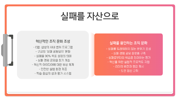 작은 실험 문화 만들기: 큰 위험 없이 새로운 아이디어를 시도해볼 수 있는 환경을 조성합니다.