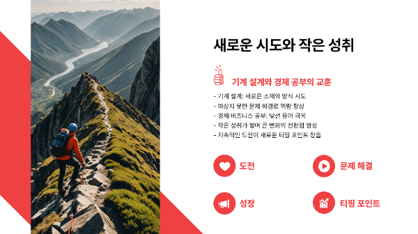 처음에는 "그동안 왜 그냥 지나쳤지?" 하는 후회가 들었습니다. 하지만 후회도 잠시, '이제라도 이 아이디어를 실행해보자'라는 마음으로 하나씩 실무에 적용하기 시작했지요. 기계 설계 프로젝트를 개선하는 아이디어부터 협업부서와의 소통방식을 개선하는 팁까지, 처음엔 아주 미세한 변화였지만 시간이 지날수록 성과가 눈에 띄게 나타나기 시작했습니다.