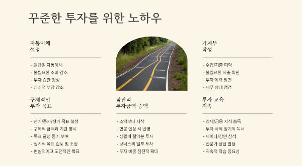 또 한 가지 도움이 되었던 것은 투자 목표를 구체적으로 설정한 것입니다. 단순히 "돈을 모으자"보다는 "5년 후 주택 구입을 위한 자금 마련", "10년 후 자녀 교육비 준비" 같은 명확한 목표가 있으니 투자를 중단하고 싶은 유혹을 이겨낼 수 있었습니다. 목표와 함께 달성 시기도 구체적으로 정했기 때문에, 단기 변동에 흔들리지 않고 장기적인 관점을 유지할 수 있었습니다.