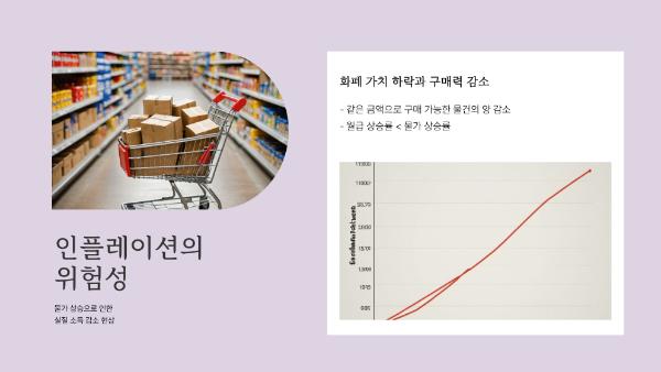 인플레이션이 지속되면, 화폐 가치가 떨어져 같은 금액으로 살 수 있는 물건의 양이 점점 줄어듭니다. 저 역시 회사에서 기계 설계를 하며 안정적인 월급을 받고 있지만, 장바구니 물가가 조금씩 오를 때마다 '고정된 월급만으로는 부족하다'라는 현실을 자주 느낍니다. 월급이 오르는 속도보다 물가가 오르는 속도가 빠를 때, 내 실질소득은 마치 뒷걸음질 치는 것처럼 느껴지죠.