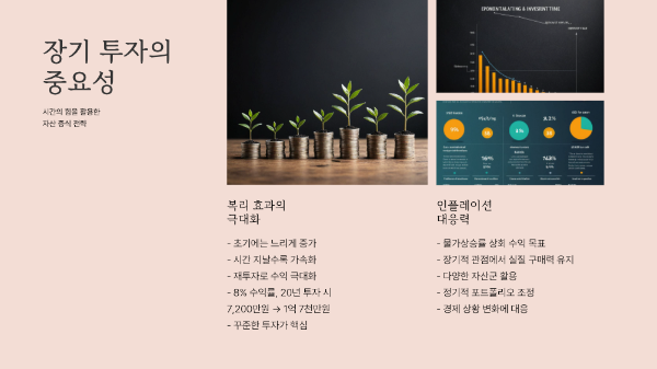 인플레이션이야말로 '단기'와는 무관합니다. 물가가 한 달 새 급격히 폭등하지 않는다 해도, 1년이 지나고 3년이 지나면 가파른 상승 곡선을 그리게 마련이죠. 반대로 투자 수익도 하루아침에 큰 폭으로 오르기보다는, 마치 복리처럼 서서히 쌓여 갑니다.