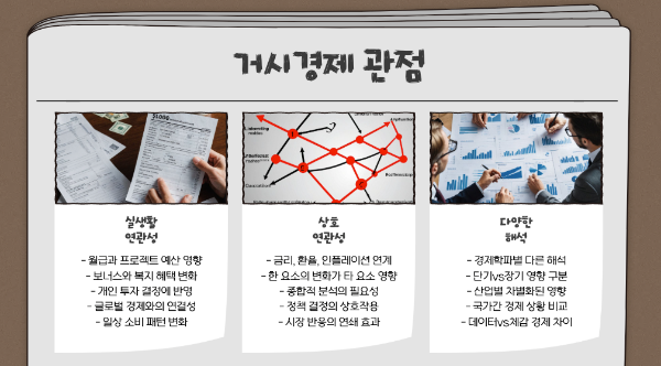 거시경제는 다양한 관점에서 바라볼 수 있습니다. 소비자로서는 물가 상승이 가계 지출에 미치는 영향을, 투자자로서는 자산 가치 변동을, 직장인으로서는 고용 안정성과 임금 상승 가능성을 각각 중요하게 생각하게 되죠. 세계 경제가 서로 긴밀히 연결된 요즘은 중국의 부동산 시장 불안이나 미국의 금리 정책이 우리나라 경제와 내 지갑에도 영향을 미치는 세상이 되었습니다. 저도 회사에서 해외 바이어와 거래할 때 글로벌 경제 상황을 고려하지 않을 수 없게 되었습니다.