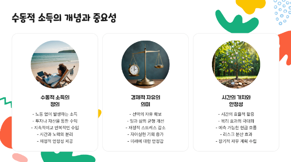 이때 떠오른 질문이 바로 “어떻게 하면 돈이 당신을 위해 일하게 하기가 가능할까?” 였습니다. 조금 거창하게 들리지만, 사실 그 답은 이미 주변의 부자들은 실천 중이었습니다. 시간을 온전히 투입하지 않아도 돈이 계속해서 생성되거나 불어나는 구조, 즉 수동적 소득(패시브 인컴)을 여러 갈래로 만들어놓고 있었던 것입니다. 주식 배당금, 부동산 임대수익, 배당형 펀드, 지식재산권 로열티 등이 그 대표적 예시죠.