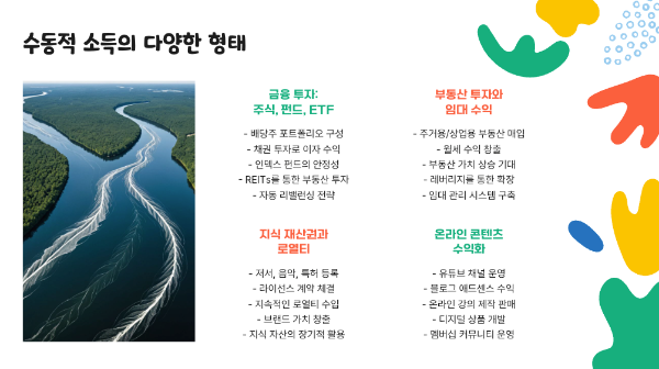 이때 떠오른 질문이 바로 “어떻게 하면 돈이 당신을 위해 일하게 하기가 가능할까?” 였습니다. 조금 거창하게 들리지만, 사실 그 답은 이미 주변의 부자들은 실천 중이었습니다. 시간을 온전히 투입하지 않아도 돈이 계속해서 생성되거나 불어나는 구조, 즉 수동적 소득(패시브 인컴)을 여러 갈래로 만들어놓고 있었던 것입니다. 주식 배당금, 부동산 임대수익, 배당형 펀드, 지식재산권 로열티 등이 그 대표적 예시죠.