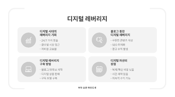 디지털 시대는 레버리지 원리 활용의 황금기입니다. 한 번 만든 디지털 콘텐츠는 계속해서 가치를 창출할 수 있기 때문입니다.