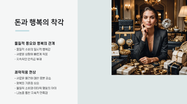하지만 과연 그럴까요? 고가의 물건을 구매하거나 비싼 경험을 했을 때 느끼는 행복감은 왜 그렇게 빨리 사라질까요? 심리학에서는 이를 '쾌락의 적응(hedonic adaptation)' 현상이라고 부릅니다. 인간은 새로운 상황이나 물건에 놀랍도록 빨리 적응하는 능력이 있어서, 처음에는 행복감을 느끼다가도 곧 그것이 일상이 되면 더 이상 특별한 행복을 느끼지 못하게 됩니다.