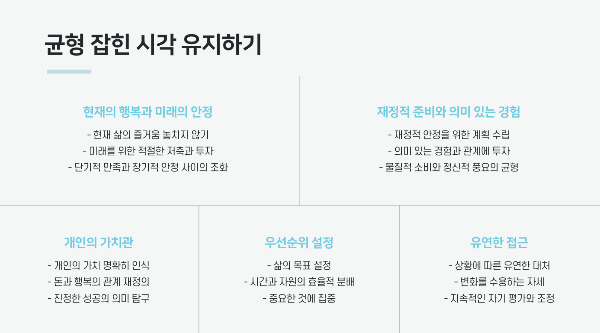 부와 행복의 관계는 결국 균형의 문제입니다. 미래의 안정과 자유를 위해 재정적 준비를 하되, 현재의 행복과 의미 있는 경험도 소홀히 하지 않는 것. 여기에 타인을 돕고 사회에 기여하는 이타적 가치를 더하는 것이 진정한 부와 행복의 조화입니다.