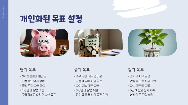 재무 목표는 크게 단기(1-2년), 중기(3-5년), 장기(5년 이상) 목표로 나눌 수 있습니다: