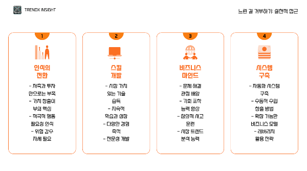 - 시스템 구축: 당신의 직접적인 시간 투입 없이도 가치를 창출할 수 있는 시스템을 개발하세요.