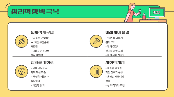 - 사회적 지지 활용하기 - 비슷한 목표를 가진 친구나 커뮤니티와 목표를 공유하고 서로 격려하세요.
