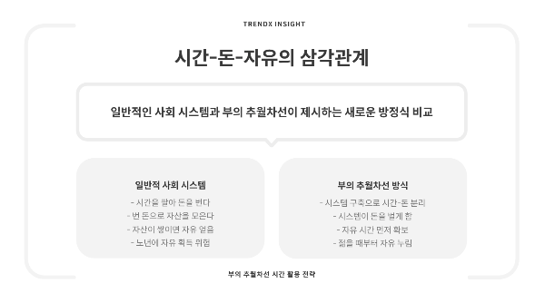 부의 추월차선 개념에서 가장 핵심은 '돈-시간-자유'의 관계를 재정립하는 것입니다. 일반적인 사회 시스템은 다음과 같은 방정식을 제시합니다: