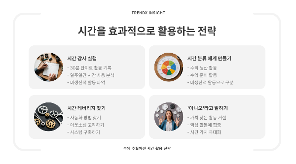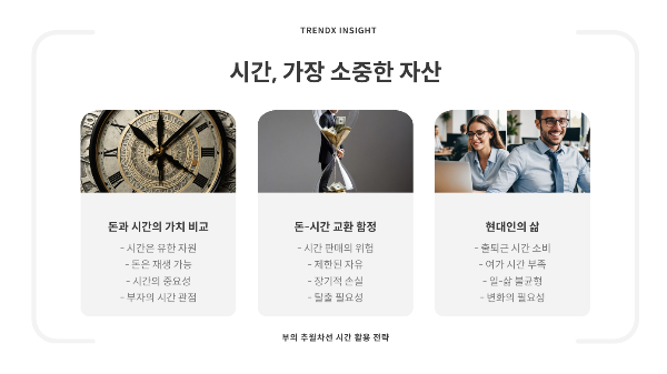 시간의 가치를 제대로 인식하고 효과적으로 활용하는 것은 현대 사회에서 진정한 부와 행복을 달성하는 핵심 요소입니다. '부의 추월차선'에서 강조하듯, 단순히 돈을 많이 버는 것이 아니라 시간의 자유를 얻는 것이 진정한 부의 목표가 되어야 합니다.