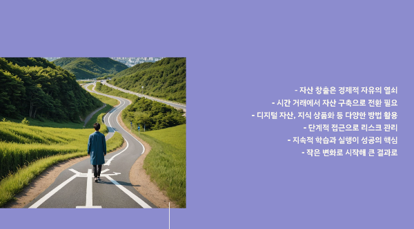 자산 창출로의 전환은 단순히 돈을 더 버는 방법을 넘어, 삶의 방식을 근본적으로 변화시키는 여정입니다. 시간을 돈과 교환하는 방식에서 벗어나, 자신만의 가치 창출 시스템을 구축함으로써 진정한 경제적 자유를 얻을 수 있습니다.