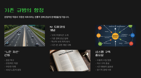 회사에서 열심히 일하며 연봉을 올리려 노력하는 것보다, 시스템을 만들어 자산을 구축하는 것이 진정한 부의 추월차선이라는 개념은 혁신적 사고의 좋은 예시입니다. 기존 교육 시스템이나 사회적 통념과는 완전히 다른 접근법이죠.
