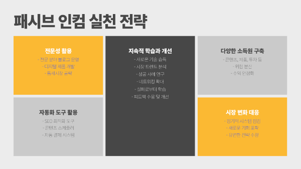 이 원칙들은 모두 패시브 인컴 시스템을 만드는 데 필수적인 요소들입니다.