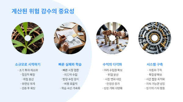 모든 것을 한 번에 걸지 마세요. 작은 규모로 시작하여 점진적으로 확장해 나가는 전략이 효과적입니다. 퇴사 전에 부업으로 시작해보거나, 초기 투자금을 최소화할 수 있는 방법을 찾아보세요.