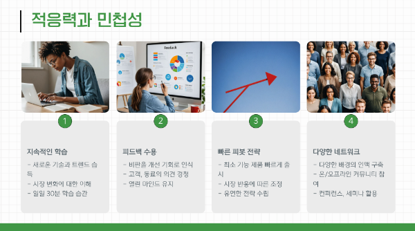두 번째는 피드백 수용 능력입니다. 자신의 아이디어나 제품에 대한 비판적 의견을 방어적으로 받아들이지 말고, 개선의 기회로 여기는 마음가짐이 필요합니다. 사용자, 고객, 동료의 피드백은 시장의 요구를 직접적으로 반영하는 소중한 자산입니다.