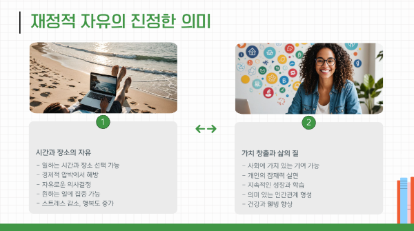혁신과 적응력은 단순히 생존을 위한 도구가 아닌, 재정적 자유로 가는 지름길입니다. '부의 추월차선'에서는 진정한 부는 시간과 장소에 구애받지 않는 자유를 의미한다고 말합니다.
