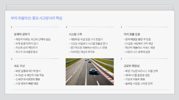 넷째, 속도를 우선시하세요. '부의 추월차선'이란 이름처럼, 빠른 속도로 부를 구축할 수 있는 경로를 찾아야 합니다. 40년 동안 저축해서 은퇴하는 '서행 차선'이 아닌, 5-10년 안에 재정적 자유를 달성하는 '추월 차선'을 선택하세요.