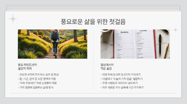 풍요의 마인드셋을 갖는다는 것은 단순히 부자가 되기 위한 방법이 아닌, 더 풍요롭고 의미 있는 삶을 살기 위한 접근법입니다. 이는 돈뿐만 아니라 시간, 관계, 건강, 행복 등 삶의 모든 영역에 적용됩니다.