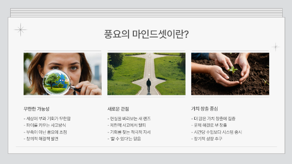 풍요의 마인드셋은 단순한 심리적 변화를 넘어 실질적인 삶의 변화를 가져옵니다.