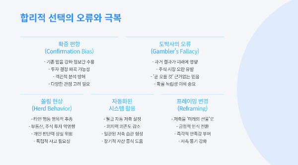 자신의 심리를 이해하고 활용하기: 우리는 모두 비합리적 결정을 내리기 쉽습니다. 이를 인정하고, 자동이체 같은 시스템을 활용해 심리적 약점을 우회하는 전략이 필요합니다.