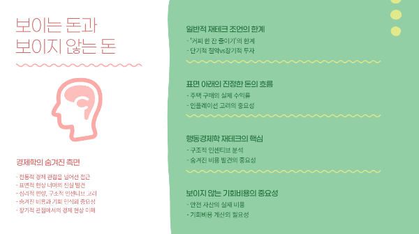 행동경제학 재테크의 핵심은 이런 표면적 현상 너머의 진실을 발견하는 것입니다. 심리적 편향, 구조적 인센티브, 그리고 숨겨진 비용이 돈의 진짜 흐름을 결정하는 경우가 많습니다. 우리는 눈에 보이는 지출만 계산하지만, 실제로는 보이지 않는 기회비용이 더 클 수 있습니다. 예컨대 안전한 예금에만 의존하는 결정의 진짜 비용은 인플레이션으로 인한 구매력 감소와 더 높은 수익 기회를 놓치는 비용입니다.