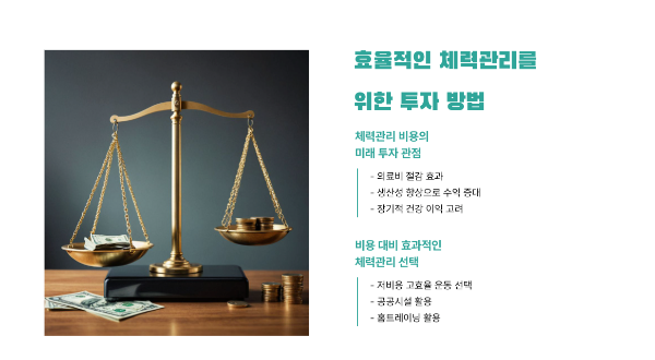 체력관리에 시간과 비용을 투자하는 것은 단순한 지출이 아닌 미래를 위한 투자로 바라볼 필요가 있습니다. 헬스장 회원권, 운동 장비, 또는 건강식품에 지출하는 비용은 미래의 의료비 절감과 생산성 향상으로 돌아오는 재테크방법의 일환으로 볼 수 있습니다.