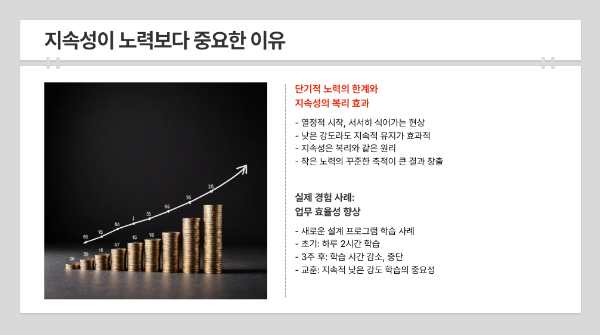 이처럼 지속성은 단기적으로는 눈에 띄지 않지만, 장기적으로는 인생의 큰 변화를 가져옵니다. 노력의 강도보다 지속성이 더 중요한 이유가 바로 여기에 있습니다.