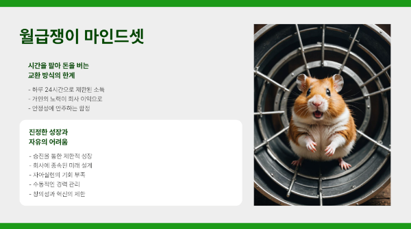 많은 직장인들이 겪는 가장 큰 함정은 '시간을 팔아 돈을 버는' 교환 방식에 갇혀 있다는 점입니다. 아무리 열심히 일해도 하루는 24시간으로 제한되어 있고, 내 노력의 결실은 고스란히 회사의 것이 됩니다. 이런 구조에서 진정한 성장과 자유를 찾기란 쉽지 않습니다.