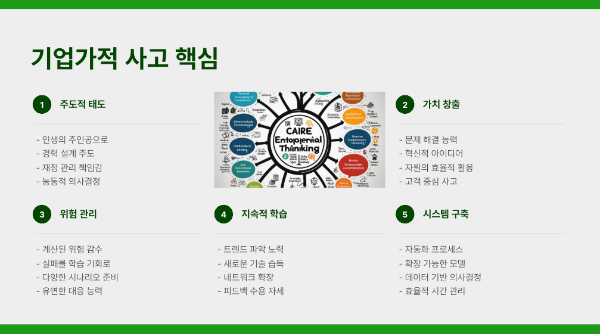 기업가적 사고방식은 단순히 사업을 시작하는 것이 아닙니다. 그것은 인생의 모든 영역에서 주도권을 가지고, 가치를 창출하며, 시스템을 구축하는 태도입니다. 직원이 '문제를 해결하는 사람'이라면, 기업가는 '시스템을 만드는 사람'입니다.