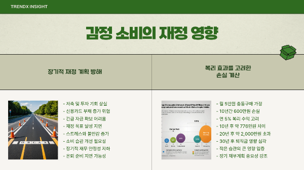 충동적 소비의 가장 큰 문제는 장기적인 재정 계획을 방해한다는 점입니다. 생각해보면 한 번의 충동구매는 큰 문제가 아닐 수 있지만, 이러한 패턴이 반복되면 어떻게 될까요?
