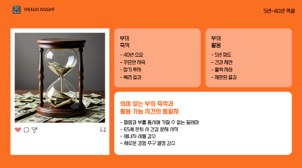 느린 길의 가장 큰 비극은 '5년-40년 역설'이라고 부를 수 있는 현상입니다. 이것은 무엇을 의미할까요? 전통적인 재테크 방식으로 의미 있는 부를 축적하려면 약 40년이 필요하지만, 그 부를 온전히 즐기고 활용할 수 있는 건강한 시간은 약 5년에 불과할 수 있다는 것입니다.